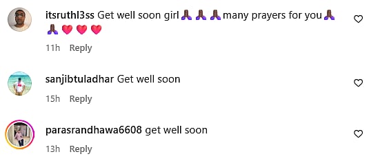 A fan commented on the above post, "Get well soon girl🙏🏾🙏🏾🙏🏾many prayers for you (sic)." One more fan wrote, " Get well soon." Check out the comments below...