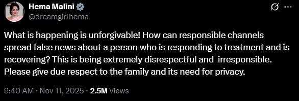 The veteran actress tweeted, "What is happening is unforgivable! How can responsible channels spread false news about a person who is responding to treatment and is recovering? This is being extremely disrespectful and irresponsible. Please give due respect to the family and its need for privacy (sic)."