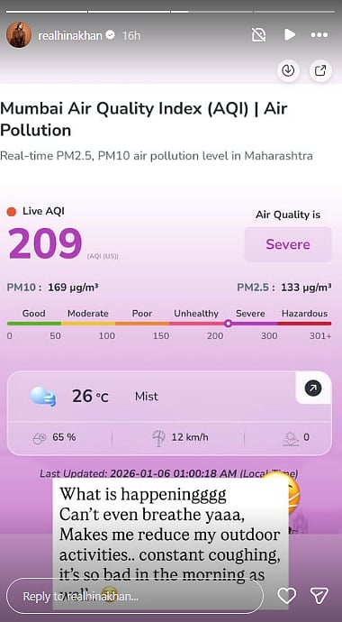 On Tuesday (January 6), Hina took to her Instagram story to post a screenshot highlighting Mumbai’s poor Air Quality Index (AQI). Expressing her distress, she wrote, “What is happening? Can’t even breathe, yaaa,” adding that the worsening air has made it difficult for her to step out.