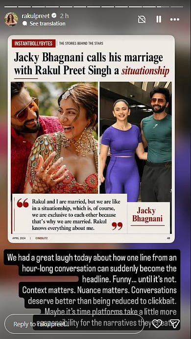 Bollywood actress Rakul Preet Singh responded to criticism and online debate sparked by actor-husband Jackky Bhagnani’s recent “situationship” remark about their marriage. On Friday, Rakul clarified that his statement was taken out of context and amplified as a headline.