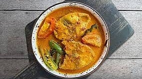In a small pan, dry roast red chillies, coriander seeds, cumin seeds, fenugreek seeds, and peppercorns on a low flame until aromatic. Remove from flame and let it cool. Grind the roasted spices with grated coconut, garlic, turmeric, and onion. Add water gradually to make a smooth, thick paste. Keep aside. Heat coconut oil in a non-stick pan or a heavy-bottomed vessel. Add the chopped onion and sauté on a low flame till light golden. Add the ground masala and sauté for 5 minutes on low flame until the oil begins to separate. Add tamarind pulp and sufficient water for a medium-thick gravy. Add salt and bring to a boil. Gently add the fish pieces and simmer. Stir gently so that the fish does not break. Cook covered for 7–10 minutes or until the fish is just done. Let the curry rest for a few minutes so that the flavour gets infused. Serve hot with steamed rice.