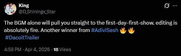 Well, the trailer has impressed one and all. A netizen tweeted, "The BGM alone will pull you straight to the first-day-first-show. editing is absolutely fire. Another winner from #AdiviSesh 🔥 🔥 #DacoitTrailer (sic)."
