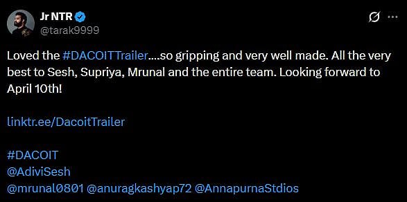 Even Jr NTR took to X to praise the trailer. He tweeted, "Loved the #DACOITTrailer….so gripping and very well made. All the very best to Sesh, Supriya, Mrunal and the entire team. Looking forward to April 10th! (sic)." Check out the comments below...