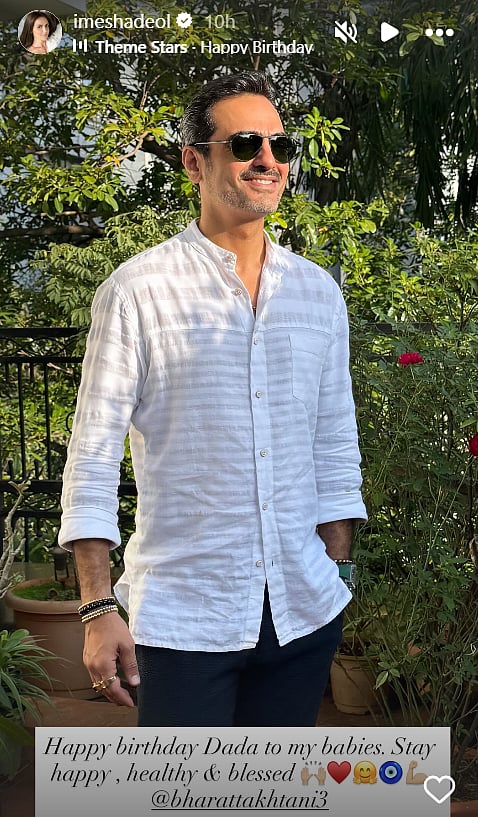 Actress Esha Deol, on Sunday, took to her Instagram story to wish Happy Birthday to her ex-husband Bharat Takhtani. The actress shared a picture of Bharat and wrote, “Happy Birthday Dada to my babies. Stay happy, healthy, and blessed.”