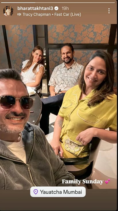 A few days ago, on a Sunday, Esha, her sister Ahana Deol, and Bharat had met for lunch. Bharat had posted a picture of them on his Instagram story and captioned it as, “Family Sunday.”