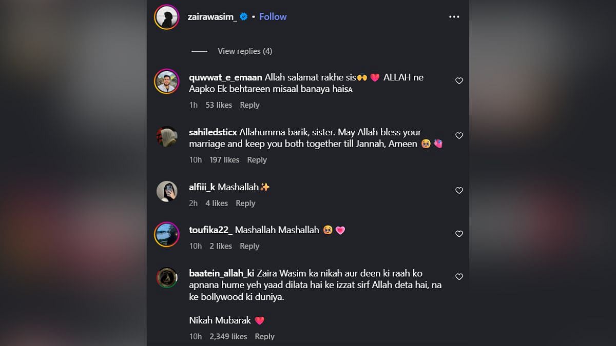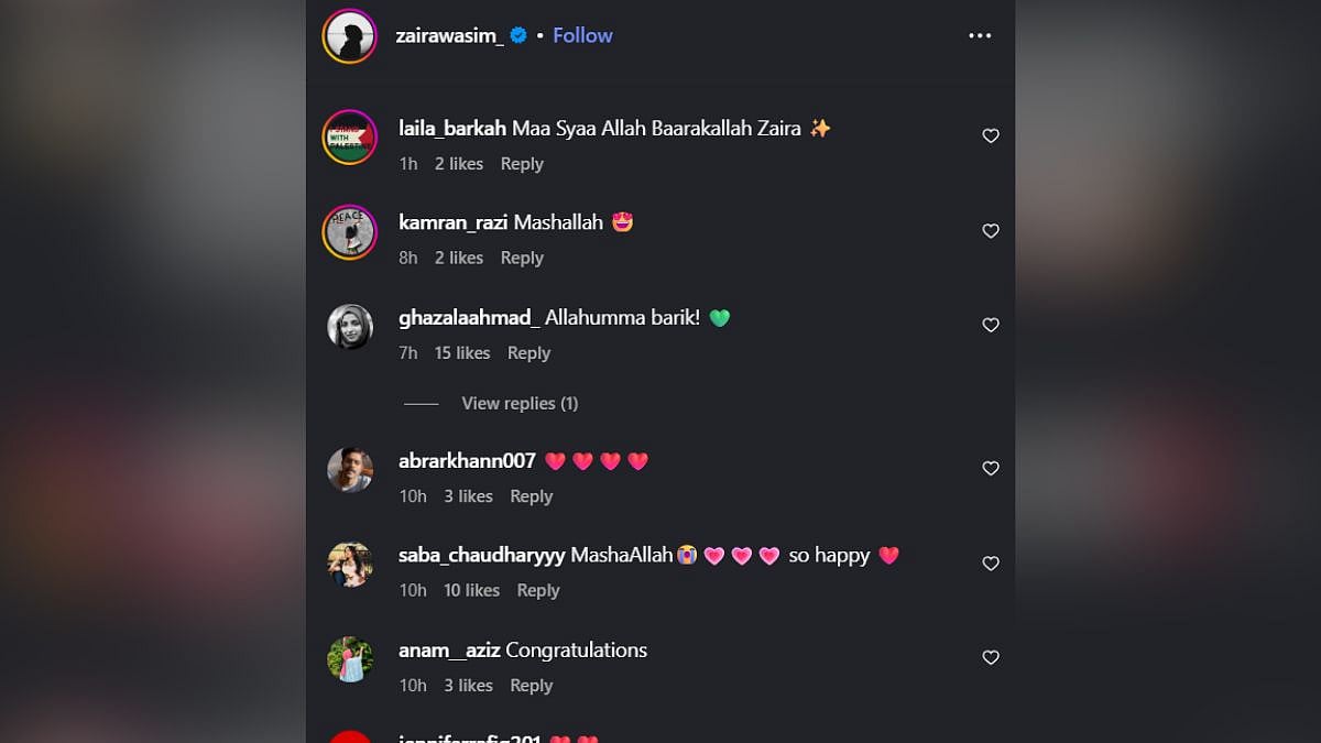 The third comment read, "@zairawasim_ Wal’Laahi my sister, I’m so happy for you. My words fail, tears almost came. May Allah bless this union! You left everything for Rab and He had and will shower his blessings upon you and now upon your partner also, In’Shaa’Allah."