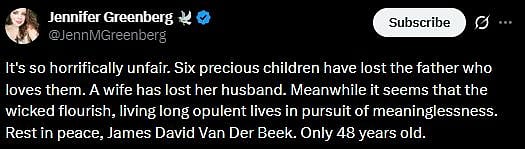 One more fan wrote, "It's so horrifically unfair. Six precious children have lost the father who loves them. A wife has lost her husband. Meanwhile it seems that the wicked flourish, living long opulent lives in pursuit of meaninglessness. Rest in peace, James David Van Der Beek. Only 48 years old (sic)." Check out the tweets below...