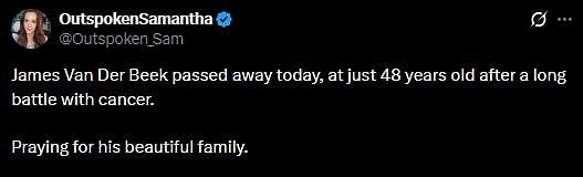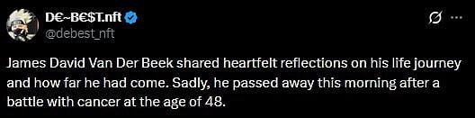 Another fan wrote, "James David Van Der Beek shared heartfelt reflections on his life journey and how far he had come. Sadly, he passed away this morning after a battle with cancer at the age of 48 (sic)."