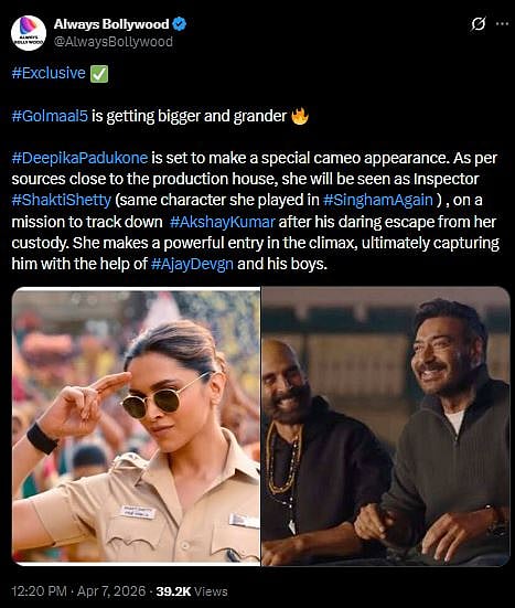 Always Bollywood posted about Deepika's casting in the film and also revealed that her character will come in the climax, capturing Akshay Kumar's character with the help of Ajay and other actors. Check out the tweet below...