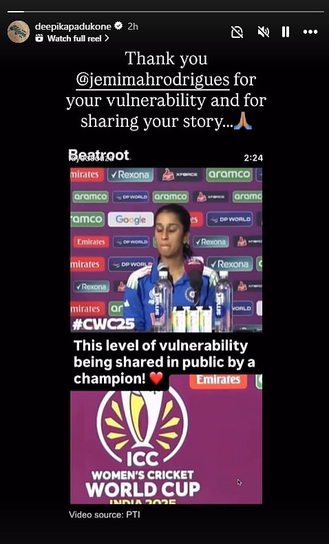Deepika Padukone, who has been appointed as the first-ever 'Mental Health Ambassador' by the Union Ministry of Health & Family Welfare, took to her Instagram story on Friday and wrote, "Thank you Jemimah Rodrigues for your vulnerability and for sharing your story (folded hand emoji)."