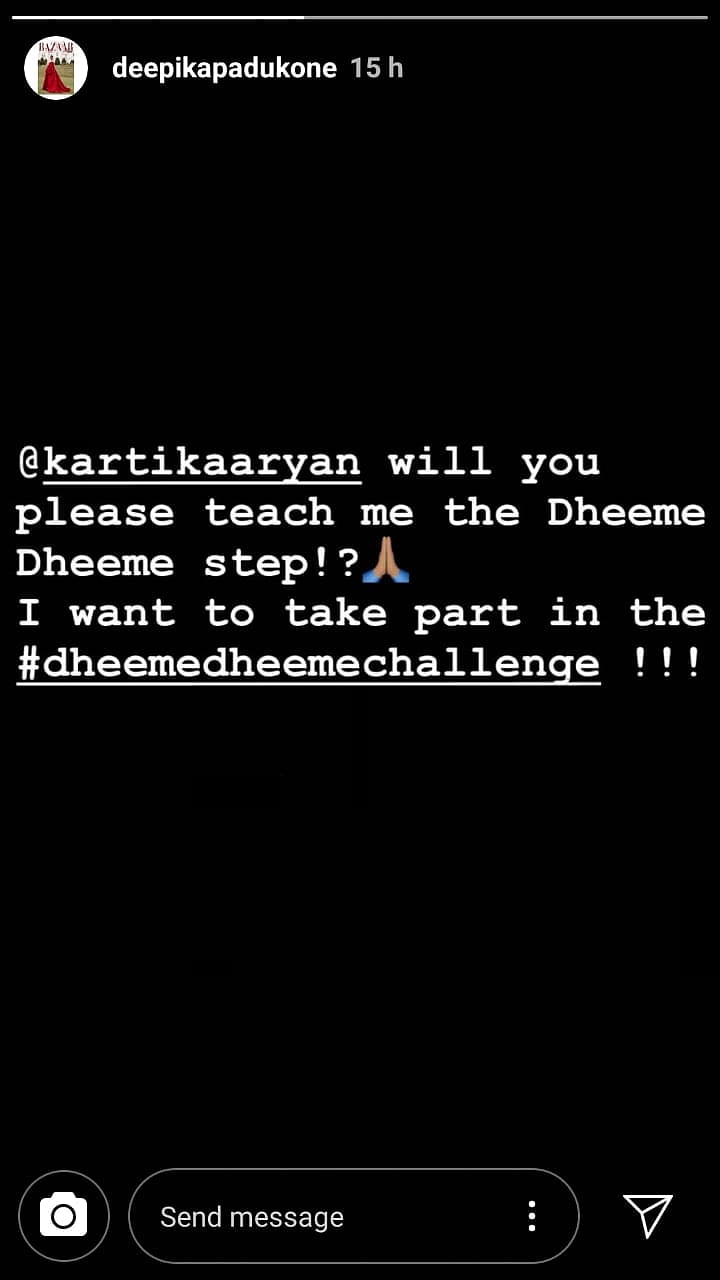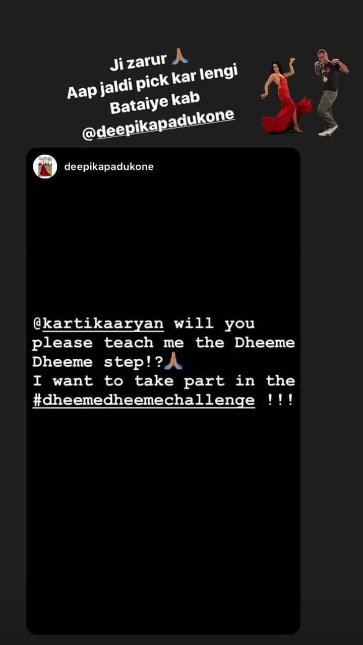 The 'Padmaavat' actor on Friday took to the Instagram story and tagged Kartik writing, "Will you please teach me the Dheeme Dheeme step!?" "I want to take part in the #dheemedheemechallenge !!!" she added.