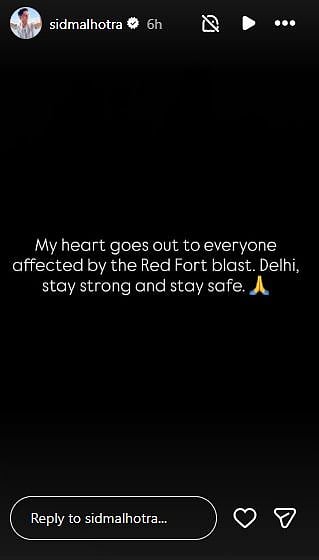 Sidharth Malhotra shared on his Instagram story, "My heart goes out to everyone affected by the Red Fort blast. Delhi, stay strong and stay safe (sic)."