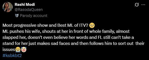 Another X user wrote, "Most progressive show and Best ML of ITV? 🥹 ML pushes his wife, shouts at her in front of whole family, almost slapped her, doesn't even believe her words and FL still can't take a stand for her just makes sad faces and then follows him to sort out their issues (sic)."