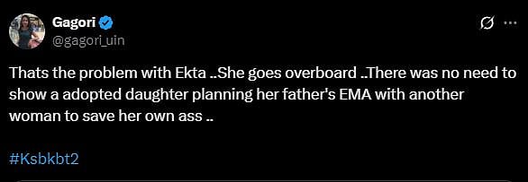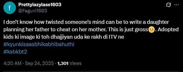 A netizen tweeted, "I don't know how twisted someone's mind can be to write a daughter planning her father to cheat on her mother. This is just gross😐. Adopted kids ki image ki toh dhajjiyan uda ke rakh di ITV ne #kyunkisaasbhikabhibahuthi (sic)."