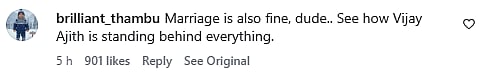 Reacting to the video, a netizen commented, "Great AI work...Ajith was in dubai on this date (sic)." Another Instagram user wrote, "Marriage is also fine, dude.. See how Vijay Ajith is standing behind everything (sic)."
