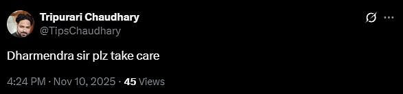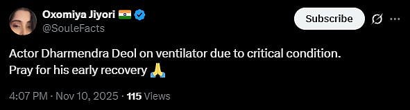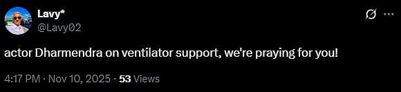 Another X user wrote, "Actor Dharmendra on ventilator support, we're praying for you! (sic)." One more fan tweeted, "Actor Dharmendra Deol on ventilator due to critical condition. Pray for his early recovery (sic)." Check out the tweets below...