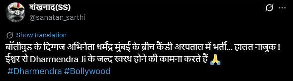 A fan tweeted, "Bollywood ke diggaj abhineta Dharmendra Mumbai ke Breach Candy hospital mein bharti... Halat naazuk! Eeshwar se Dharmendra ji ke jald svasth hone ki kaamana karte hain (sic)."