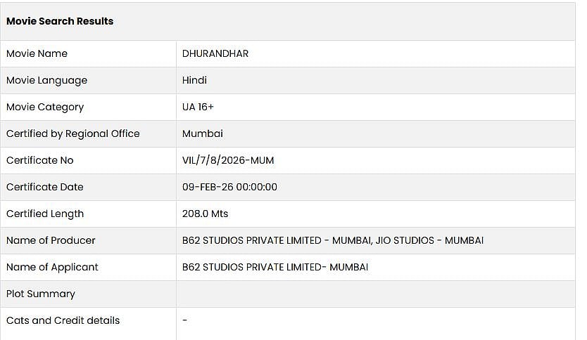 According to the Central Board of Film cerfitication website, Dhurandhar 2 was certified on February 9, 2026. The runtime of the film is 208 minutes, which means it is 3 hours 28 minutes long. Not just that, the website has mentioned that the film has received U/A 16+ certificate.