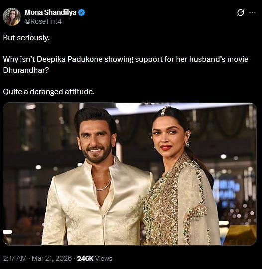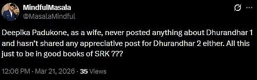 One more netizen tweeted, "Deepika Padukone, as a wife, never posted anything about Dhurandhar 1 and hasn’t shared any appreciative post for Dhurandhar 2 either. All this just to be in good books of SRK ??? (sic)." Check out the tweets below...