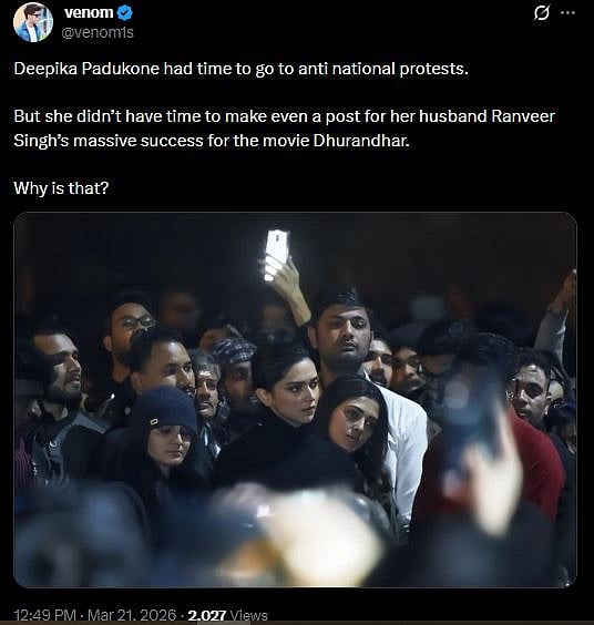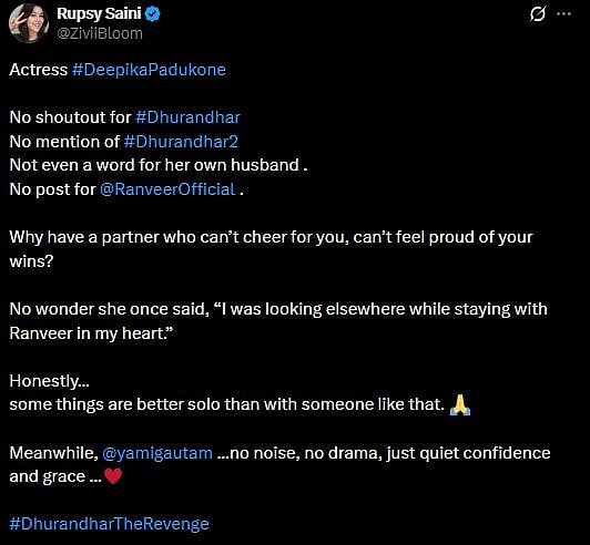A netizen tweeted, "Deepika Padukone had time to go to anti national protests. But she didn’t have time to make even a post for her husband Ranveer Singh’s massive success for the movie Dhurandhar. Why is that? (sic)."