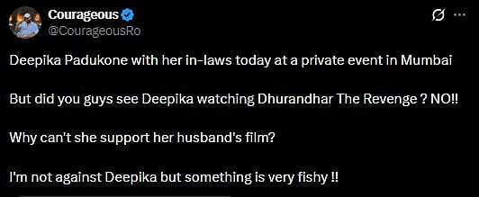 Another X user wrote, "Deepika Padukone with her in-laws today at a private event in Mumbai But did you guys see Deepika watching Dhurandhar The Revenge ? NO!! Why can't she support her husband's film? I'm not against Deepika but something is very fishy!! (sic)."