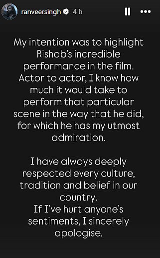 He posted, "My intention was to highlight Rishab's incredible performance in the film. Actor to actor, I know how much it would take to perform that particular scene in the way that he did, for which he has my utmost admiration. I have always deeply respected every culture, tradition and belief in our country. If I've hurt anyone's sentiments, I sincerely apologise (sic)."