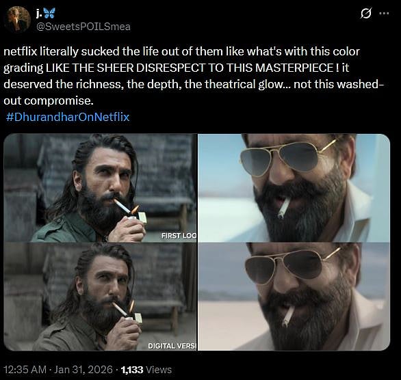 A netizen tweeted, "Netflix literally sucked the life out of them like what's with this color grading LIKE THE SHEER DISRESPECT TO THIS MASTERPIECE ! it deserved the richness, the depth, the theatrical glow… not this washed-out compromise. #DhurandharOnNetflix (sic)."