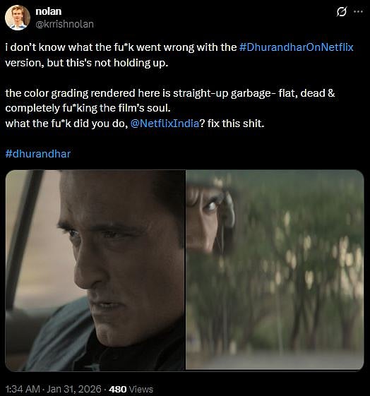 One more netizen tweeted, "I don’t know what the fu*k went wrong with the #DhurandharOnNetflix version, but this's not holding up. the color grading rendered here is straight-up garbage- flat, dead & completely fu*king the film’s soul. what the fu*k did you do, @NetflixIndia ? fix this shit (sic)." Check out the tweets below...