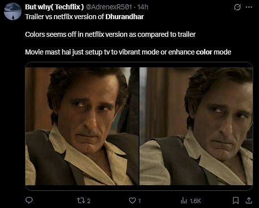 Another X user tweeted, "DESATURATED COLORS of Dhurandhar movie on NETFLIX colors look very desaturated on ott print, i verified both SDR and HDR. Both looks desaturated. Idk whats the possible reason (sic)."