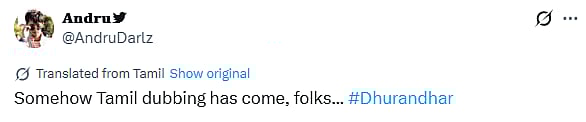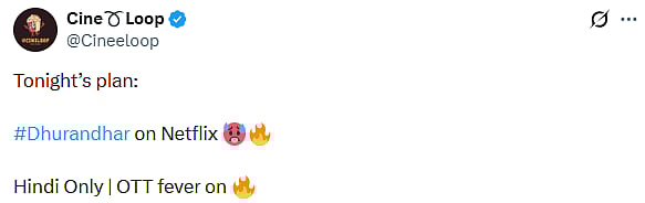 A netizen tweeted, "Reminder Set 🤩 But : #Dhurandhar — 10 Mins Cut in OTT🙂 Theatrical Version : 3 Hours 34 Mins OTT Netflix Version : 3 Hours 25 Mins Also Tamil and Telugu audio added in #Netflix #Tamil (sic)." Another X user wrote, "Tonight’s plan: #Dhurandhar on Netflix 🥵🔥 Hindi Only | OTT fever on (sic)."