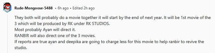 The video has gone viral, and on Reddit, netizens are discussing why Deepika might have liked the video. A Reddit user wrote, "They both will probably do a movie together it will start by the end of next year. It will be 1st movie of the 3 which will be produced by RK under RK STUDIOS. Most probably Ayan will direct it. RANBIR will also direct one of the 3 movies. If reports are true ayan and deepika are going to charge less for this movie to help ranbir to revive the studio (sic)."