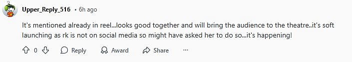 One more Reddit user wrote, "It's mentioned already in reel...looks good together and will bring the audience to the theatre..it's soft launching as rk is not on social media so might have asked her to do so...it's happening! (sic)." Check out the comments below...