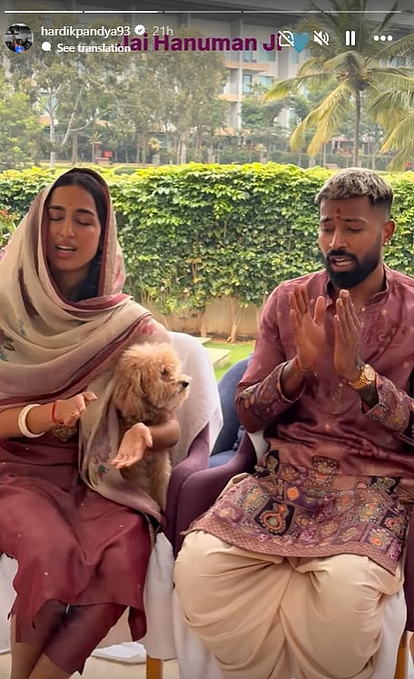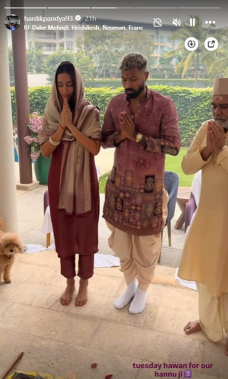 Other visuals show the couple in traditional attire, with Hardik planting a kiss on Maheika’s cheek. Photos also them participating in religious rituals.