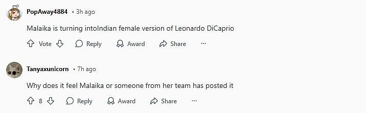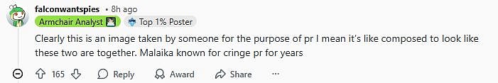 Commenting on the post, a Reddit user wrote, "Clearly this is an image taken by someone for the purpose of pr I mean it’s like composed to look like these two are together. Malaika known for cringe pr for years (sic)."