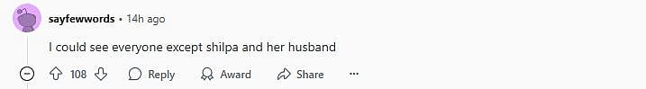 Another Reddit user wrote, "Shilpa Shitty and her Pati-Porneshwar have gotten away, LOCK him up, loose the keys (sic)." One more netizen commented, "I could see everyone except shilpa and her husband (sic)."