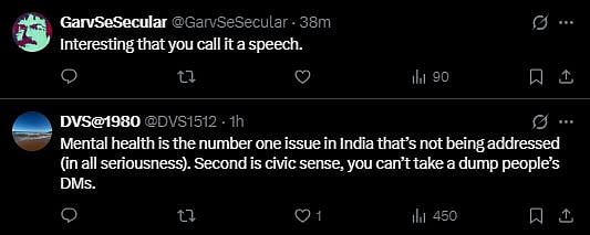 The DM read, "Die Motherf***er. Die a death that no one mourns fugly bi**h as* (sic)." Along with the screenshot, Vir tweeted, "Ahhhhh the gentle words that float towards you like a feather on an autumn breeze every time the Two India speech goes viral again because someone brings it up in retrospect saying how true it was (sic)."