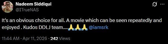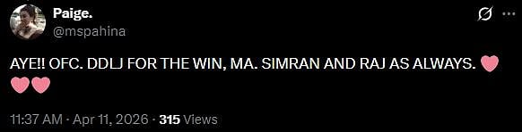 Well, netizens agree with Kajol. A netizen tweeted, "AYE!! OFC. DDLJ FOR THE WIN, MA. SIMRAN AND RAJ AS ALWAYS (sic)." Another X user wrote, "It's an obvious choice for all. A movie which can be seen repeatedly and enjoyed. Kudos DDLJ team.... (sic)."