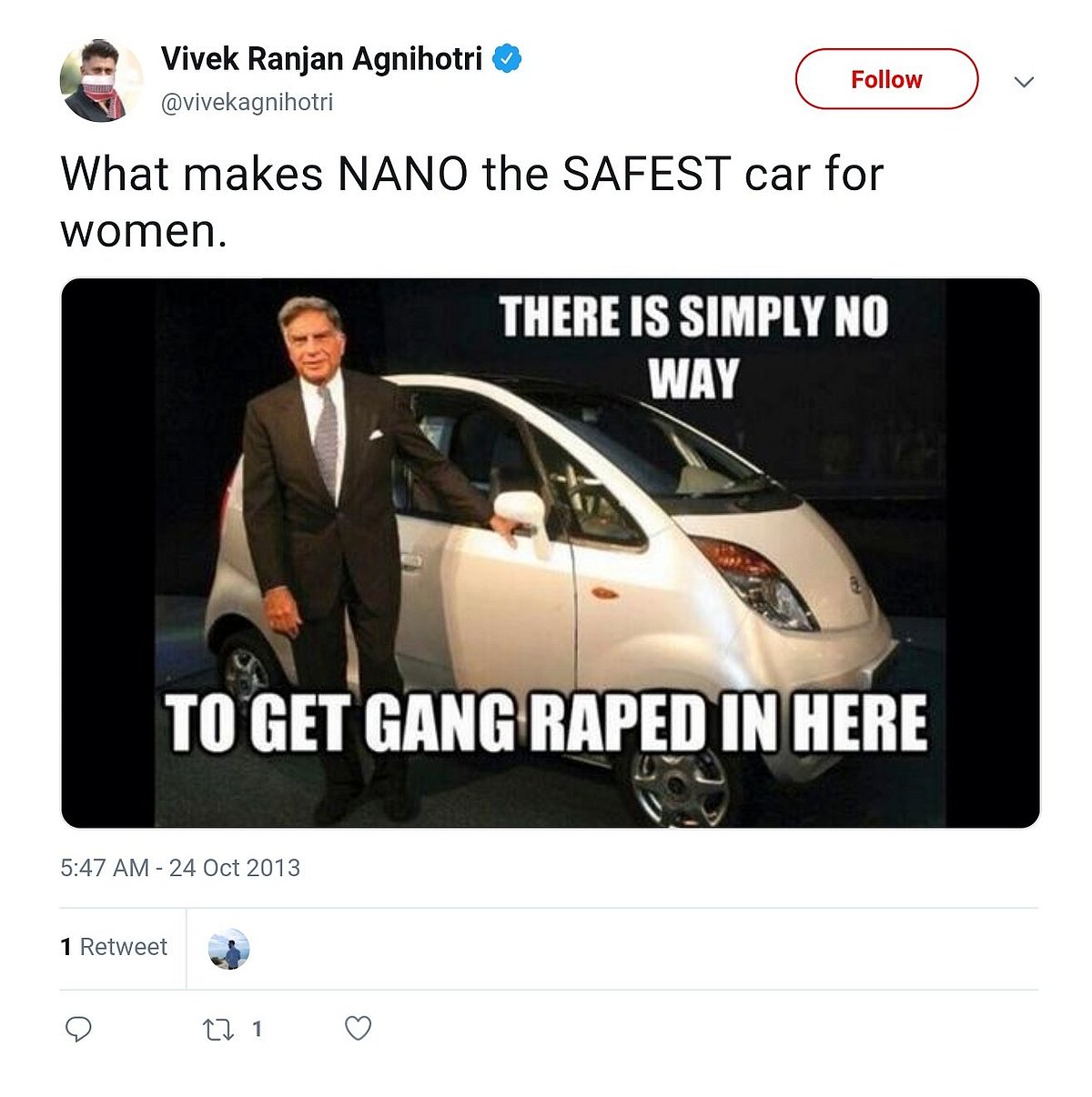 In the tweet dating back to 2013, Agnihotri had shared a photo of Tata Nano along with the text, "There is simply no way to get gang raped in here." Not just that, but he also captioned it, "What makes Nano the safest car for women".