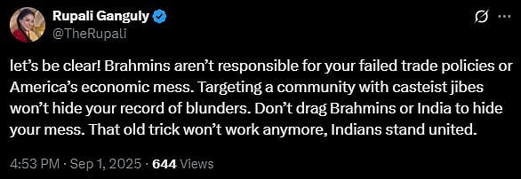 Anupamaa star Rupali Ganguly is someone who always shares her point of view about what's happening in the country. On Monday, the actress took to X (Twitter) and slammed Donald Trump's trade adviser Peter Navarro for his 'Brahmins profiteering' jibe. Rupali tweeted, "Let’s be clear! Brahmins aren’t responsible for your failed trade policies or America’s economic mess."