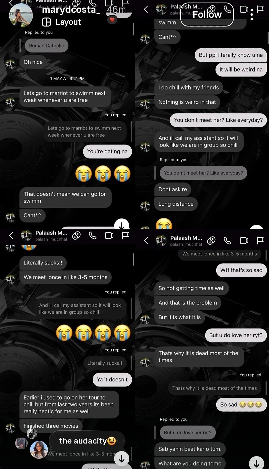 Soon after the postponement, a controversy erupted when an Instagram user named Mary D'Costa shared screenshots on Reddit of what she claims are her chats with Palaash, showing flirty exchanges that suggest he might have cheated on Smriti.