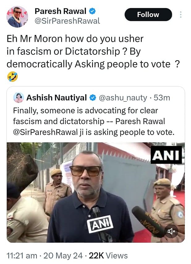 However, it soon turned abusive as the Hera Pheri actor responded to the tweet with an expletive. "Eh Mr Moron how do you usher in fascism or Dictatorship ? By democratically Asking people to vote?" he hit back.