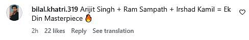 A netizen commented, "Arijit has proved how simplicity still works... Every artist should learn from this❤️❤️❤️ fake tone, hurting others doesn't work. Respect everyone in your group (sic)." Another Instagram user wrote, "Arijit Singh + Ram Sampath + Irshad Kamil = Ek Din Masterpiece (sic)."