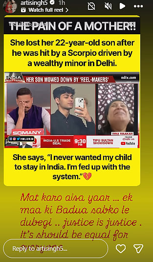 Sahil’s mother, Inna Makan, made a tearful appeal on social media, seeking action against the driver. She stated that she had raised her son as a single parent and lost him due to alleged reckless driving. Arti reacted to the heartbreaking video and, taking to her Instagram story on Tuesday, February 16, wrote, "Mat karo aisa, yaar… Ek maa ki baddua sabko le dubegi. Justice is justice; it should be equal for everyone."