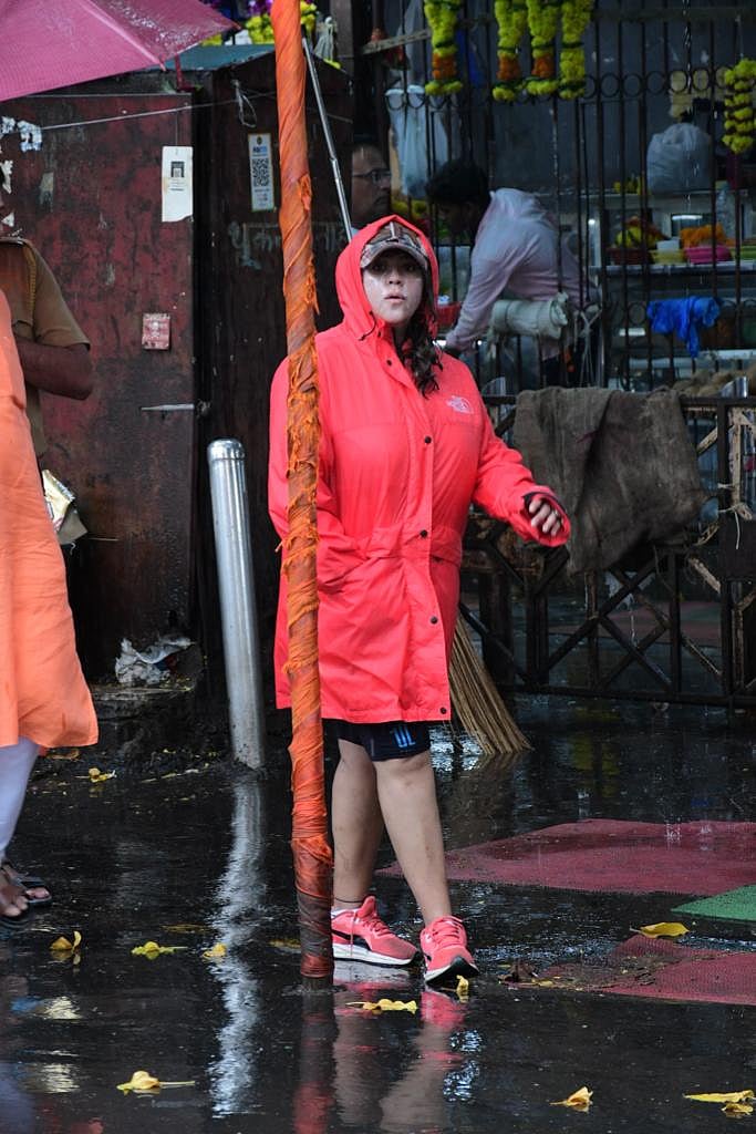 Ektaa chose to wear a t-shirt and shorts to the temple, and she covered herself with a red raincoat to beat the Mumbai rains. She was seen being escorted by a member of the temple's management, and she quickly exited after seeking blessings from the Lord.
