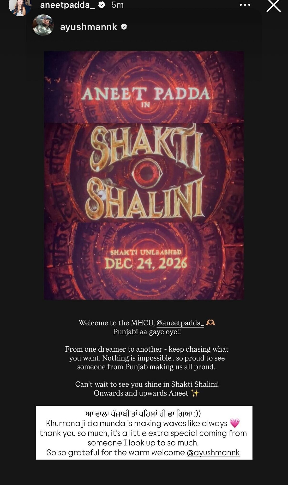 In response, Aneet replied, "This Punjabi vibe has already taken over! :)) Khurrana ji da munda is making waves like always. Thank you so much, it's a little extra special coming from someone I look upto so much. So so grateful for the warm welcome."
