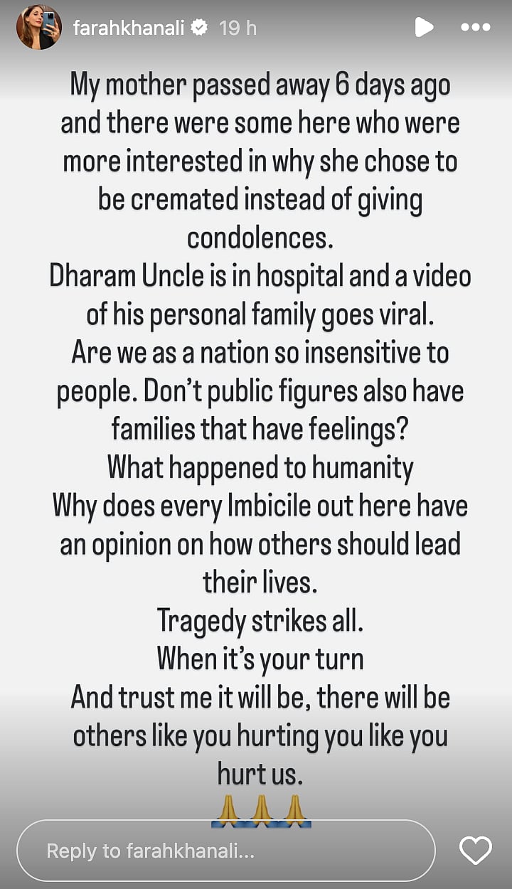 Taking to her Instagram story on Thursday evening, November 13, Farah issued a long statement, stating that after her mother passed away, several people questioned why Zarine was cremated, despite being married to a Muslim, Sanjay Khan, instead of simply offering their condolences. She wrote, "My mother passed away 6 days ago, and there were some here who were more interested in why she chose to be cremated instead of giving condolences. Dharm Uncle is in hospital and a video of his personal family goes viral."