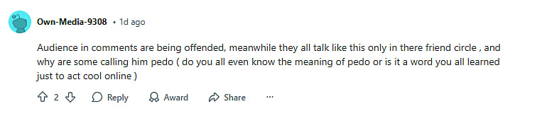 One more Reddit user wrote, " Audience in comments are being offended, meanwhile they all talk like this only in there friend circle , and why are some calling him pedo (do you all even know the meaning of pedo or is it a word you all learned just to act cool online) (sic)." Check out the comments below...