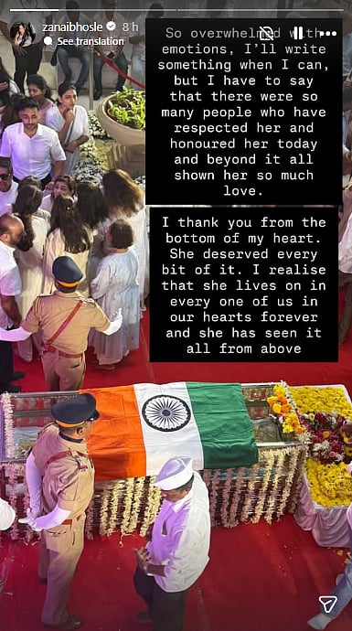 The final rites of legendary singer Asha Bhosle were held in Mumbai with full state honours on Monday (April 13), and family members, political leaders, and members of the film industry gathered to pay their last respects. Following the ceremony, her granddaughter Zanai Bhosle took to social media to share an emotional message expressing gratitude for the immense love shown toward the iconic singer.