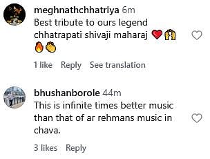 Reacting to the song, an Instagram user commented, "Best tribute to ours legend Chhatrapati Shivaji Maharaj (sic)." Another netizen wrote, "This is infinite times better music than that of ar rehmans music in chava (sic)."