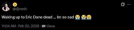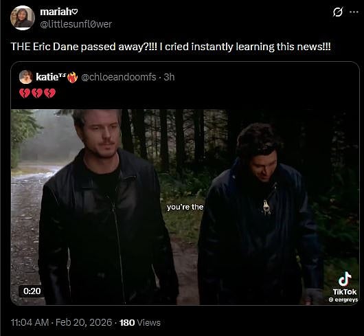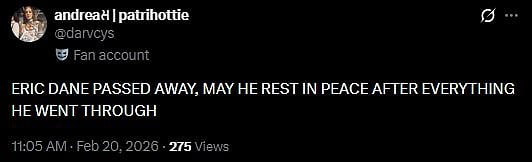 Another fan tweeted, "ERIC DANE PASSED AWAY, MAY HE REST IN PEACE AFTER EVERYTHING HE WENT THROUGH (sic)." One more fan wrote, "THE Eric Dane passed away?!!! I cried instantly learning this news!!! (sic)." Check out the tweets below...